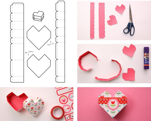 - Dùng keo dán cố định hai dải giấy đã gấp nếp vòng quanh hai mảnh hình trái tim để tạo thành hộp và nắp hộp.