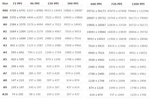 Khổ giấy A4 và các khổ giấy khác theo độ phân giải pixe