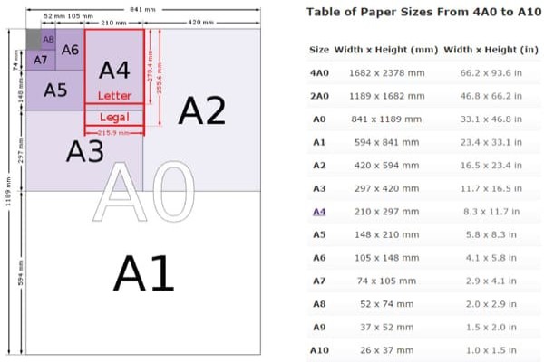 Theo tiêu chuẩn ISO 216, kích thước giấy A4 trong bảng trên phải là kích thước của khổ giấy A4, A0, A1, A2, A3, A4, A5, A6, A7, A8, A9, A10 được tính ra theo đơn vị mm và inch. Ví dụ, size giấy A5 bằng một nửa size giấy A4, kích thước A4 bằng một nửa A3,...